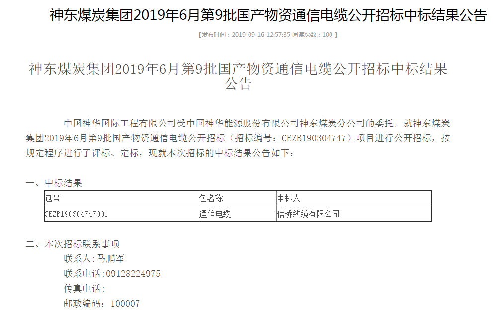 點擊數:60942019-11-21 00:00:00 來源: 神東煤炭集團2019年6月第9批國產物資通信電纜公開招標中標結果公告